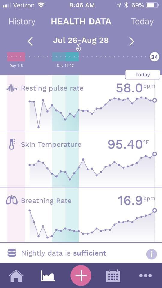 Ava will track your resting pulse rate, skin temperature, heart rate variability, and sleep quality. All of these things play into your monthly cycle. Resting pulse rate tends to increase after ovulation has occurred and remains elevated after conception. Skin temperature is low during the follicular phase (before the release of the egg) and is higher after ovulation. Heart rate variability will show you how stressed you are. Breathing rate is lower right before ovulation and rises shortly after. When trying to conceive it is very important to know when you will be ovulating. Ovulation occurs when an egg is released from the ovary and waits to be fertilized by sperm. Your egg only lives for around twelve to twenty-four hours which gives you a short amount of time to work with. On the other hand sperm can survive for up to five days. The most critical time to "baby dance" is a couple days prior to ovulation. When you do this the sperm can simply chill out and wait for the egg to say hello. Ava uses the parameters it tracks to give you a "fertile window". This window consists of the seven days before it predicts ovulation. The word "predicts" is very important here. Ava will take a while to understand you. The website claims that it takes three or more cycles to become more accurate.
